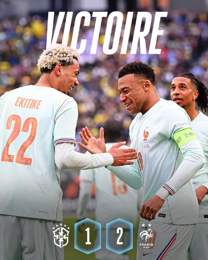 Na tarde de ontem, a seleção francesa bateu a seleção brasileira por 2 a 1, com gols de Mbappé e Ekitike para a França e de Bremer, ex-Atlético, para o Brasil.
